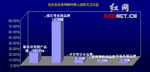 另外,調(diào)查顯示近74%的父母為寶寶使用強(qiáng)生、幫寶適等美國(guó)品牌衛(wèi)浴產(chǎn)品,其次有18%使用郁美凈等國(guó)產(chǎn)品牌,其他外國(guó)品牌的使用率不足8%。