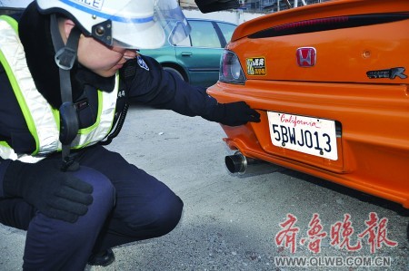 17日下午,煙臺(tái)市交警一大隊(duì)交警在南大街路段巡查時(shí),查住一輛雷人的老款本田轎跑車(chē),該車(chē)車(chē)牌寫(xiě)的全是外文。據(jù)駕駛員本人講,這副車(chē)牌是美國(guó)加利福尼亞州的車(chē)牌,他覺(jué)得洋車(chē)牌新鮮、氣派,便找別人弄到一副作廢的掛上了。交警表示,這種做法顯然是違法的,車(chē)主將面臨處罰。(記者 張琪 通訊員 趙亞林 溫全福 攝)
