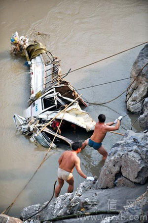 除搜救外,打撈事故車輛殘骸是昨日的重點工作之一。記者了解到,前日上午,當?shù)卣M織了80余人趕到事故現(xiàn)場,請當?shù)卮ふ业绞鹿受囕v的位置,用繩索固定,用吊葫蘆拉,但因貨車被大石卡住,只好聯(lián)系一輛25噸的吊車來打撈。