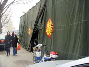 記者11時趕到分鐘寺東南角,看到在三環(huán)輔路行人道上,一個大棚支在一排修車店前。幾根金屬架子,幾塊大的深綠色厚被子搭成了這個棚子(左圖)。棚子的門口兩個大紅喜字貼在布上,棚內(nèi)左側(cè)已經(jīng)支起五個折疊桌,有兩位賓客已經(jīng)落座,右側(cè)一個大鍋正燒著旺火,并排的兩個桌子上放著雞和蔬菜,三五個人正在切肉切菜準備一會兒做飯用。