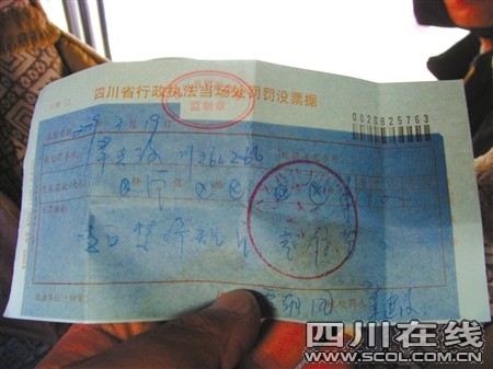 19日上午10時(shí)許,仁壽縣城區(qū)書院街,倪師傅正騎著新買的三輪車。一輛沒有牌照的長安之星警車,突然停在他面前,從車上下來兩個(gè)身著交警協(xié)警員制服的男子:“你的車不能進(jìn)城,過來接受處理!蹦邘煾到忉屨f:“警官,我是來給車上牌照的,交警大隊(duì)在城里,我必須進(jìn)城啊。”“少說這些,違反了規(guī)定就要罰款。本來罰200元,念你是初犯,交100元就是了!彪S即,坐在該車駕駛室里的一名身著交警制服的中年男子開了一張100元的罰款單據(jù),倪師傅最終只得無奈地交了罰款。