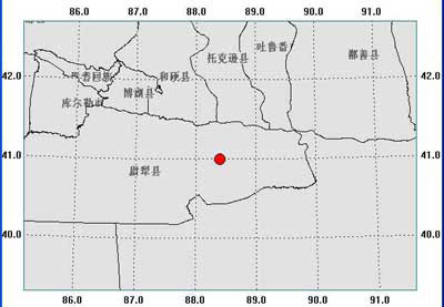 據(jù)測定,此次地震震中位于北緯 41.0°, 東經(jīng) 88.4°。目前還沒有人員傷亡和財(cái)產(chǎn)損失的報(bào)告。