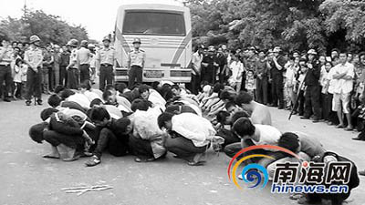兩名沙場老板因經(jīng)營利益問題產(chǎn)生糾紛,雙方各組織幾十人乘3輛大卡車持長粉槍、長勾刀等兇器欲進(jìn)行火拼。臨高警方得到消息后迅速組織160警力、20余輛警車圍追堵截,成功制止了一起聚眾斗毆事件,避免了流血事件發(fā)生。此次行動,臨高警方共查扣違法車輛6部,抓獲涉嫌持械斗毆嫌疑人58名。其中43人被刑拘、12人被行政拘留、3人待查。