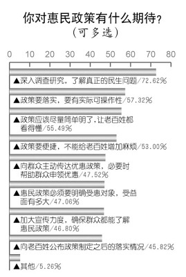 調查中,47.0%的人表示一些政策“限制太多,惠及面太小”,23.4%的認為惠民政策的最大問題是“沒有調查研究,想當然地制定政策”。
