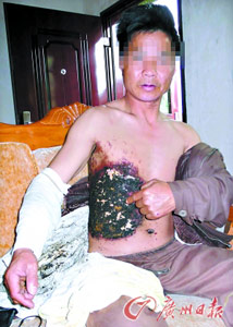 45歲的林先生心有余悸地告訴記者:“3月25日下午3時(shí)10分左右,我坐別人的摩托車去鎮(zhèn)里辦事。突然間聽到一聲爆響,一股濃煙伴著一團(tuán)刺眼的火花從身下冒出,腰腹間傳來一陣劇痛,身上衣服也突然著起了大火,連司機(jī)背上也著起了火!
