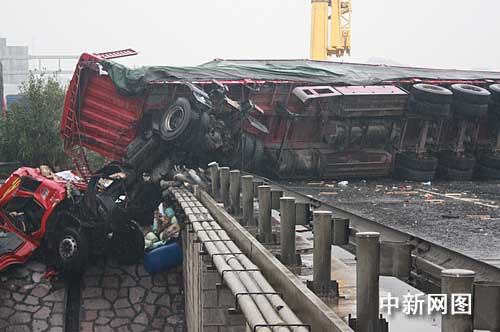 今天凌晨,一輛金華牌照的大掛車在經(jīng)過衢州與常山交界處附近的芳村溪大橋時,車輛忽然發(fā)生側翻,掛車車頭撞壞中央護欄伸出橋外,掛車車身橫向將往江西方向車道全部阻擋,事故車輛上裝載有硫酸、氫氟酸等多種危險品,其中部分危險品發(fā)生泄露。