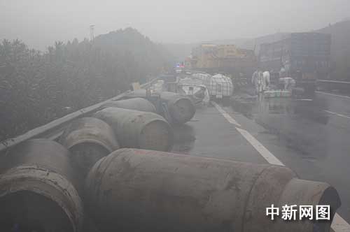 事故的影響,當天上午9點多,高速公路上被堵車輛綿延數(shù)公里。大掛車雖已被吊離,但現(xiàn)場地面上仍冒著白煙,附近散落著許多木箱、玻璃碎片和一些裝有危險品的大桶。安監(jiān)、環(huán)保等部門做了現(xiàn)場勘查,工作人員用石灰中和等多種措施來減少酸性物質對周邊土壤的腐蝕。