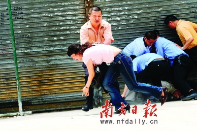 11時30分,人群中響起一陣驚呼———在張×述感到疲倦之際,一名便衣警察乘其不備按住了張持刀的手,手中的刀順勢滑落。