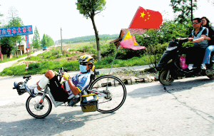 由于不好打擾騎車人的“騎興”,記者只能在與其短暫并行時了解到,他來自北京,準備就這樣一直騎到深圳。問起他在武漢境內(nèi)的騎行的感覺,他高高豎起了大拇指。記者與他分手繼續(xù)做了相關(guān)采訪,才知道這位北京哥們兒可不是什么“怪物人”,他的座駕的專業(yè)名稱叫“躺車”,在國外已經(jīng)風(fēng)靡了近一個世紀,擁有了一大批愛好者!疤绍嚒卑l(fā)力依靠的是腳力和腰力,比一般的自行車更省力、更舒服。一輛高質(zhì)量的“躺車”至少也要1200美元。如今國內(nèi)各地也開始出現(xiàn)不少“躺車”發(fā)燒友,他們大多自己DIY,還成立了聯(lián)誼會,開展專業(yè)比賽呢。(記者張寧)