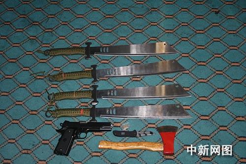 一切部署完畢后,4時40分,武裝民警分別破門而入,其中一間房內(nèi),8男1女聚集在一起正在賭賻和吸毒,另一間房內(nèi)1名嫌疑人還在呼呼大睡。這伙人還沒來得及反抗,全部束手就擒。警方在兩間房內(nèi)搜出一把仿“五四”式手槍及子彈兩發(fā),另有6把砍刀和1把匕首。