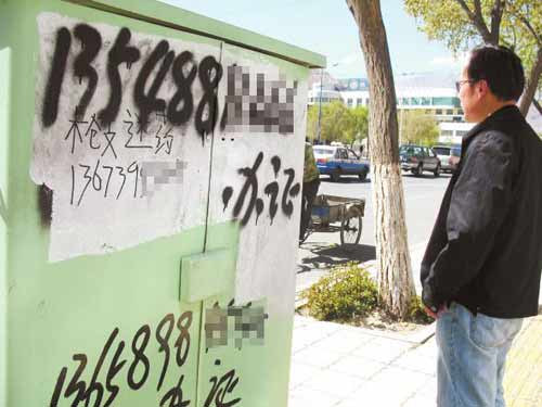 住在娘熱路附近的卓女士告訴,一些涂寫非法小廣告的人都是趁天黑或早上人比較少的時(shí)候伺機(jī)作案。他們這些人就是和管理部門‘打游擊’,很難被抓住。”卓女士告訴記者,拉薩是自治區(qū)的首府城市,而娘熱路是我市的一條主要干道,違法分子到處亂涂亂寫非法廣告嚴(yán)重影響了市容市貌,出售“槍支迷藥”的非法小廣告出現(xiàn)在城市中心地帶更會(huì)讓內(nèi)地游客擔(dān)心拉薩的社會(huì)治安,從而給拉薩的經(jīng)濟(jì)社會(huì)發(fā)展帶來(lái)不小危害,希望有關(guān)部門進(jìn)一步加大工作力度,狠狠打擊這些違法分子。