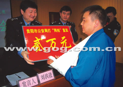 4月28日,貴陽市公安局召開“打擊‘兩搶一盜’犯罪、偵破命案”有獎舉報獎勵兌現(xiàn)新聞發(fā)布會,包括協(xié)助特警擒獲嫌疑人的的哥鄭宏等37名見義勇為的市民受到獎勵,警方為這37名市民兌現(xiàn)獎金共計157000元。