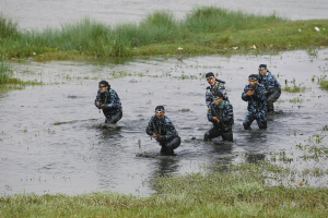 4月9日上午10時(shí)許,從湛江某地一處僻靜的港灣里,突然傳出一陣陣震天的吼聲———“絕對服從”!只見15名身穿藍(lán)色迷彩服,身背制式長槍,臉上涂著迷彩,裹著黑色頭巾的年輕人,每5人一組,合力扛著3根各約400斤重的圓木,在港灣邊上的泥濘里跋涉。