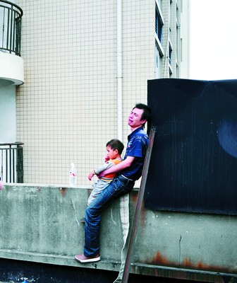 昨日下午4時20分左右,在郴州市西街一樓房的頂層,一名男子抱著自己3歲的小孩,吵著要從上面跳下來。
