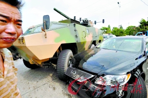 昨天下午2時(shí)30分,在107國道新塘路口經(jīng)典酒店門口處,一輛輪式裝甲車與一輛價(jià)值百萬元的凌志轎車相撞。車禍造成該路段的擁堵。同時(shí),另外一輛轎車和一輛大貨車行經(jīng)此處因避讓不及也撞上了。