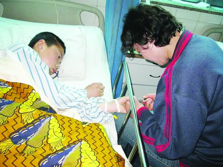 11日中午,與明明家做鄰居多年的張先生風塵仆仆趕到醫(yī)院看望明明,剛走進病房看了明明一眼,他就不忍心看第二眼,走出病房后,這位30多歲的漢子蹲在病房外流下了眼淚。
