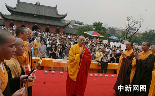 中新網(wǎng)重慶5月12日電 (孟幻 張晅)12日,汶川大地震周年祭之時(shí),重慶佛教界人士在重慶華巖寺舉行悼念及祈;顒(dòng)。14時(shí)28分,在場(chǎng)僧眾及300余位信眾默哀3分鐘。隨后,華巖寺方丈道堅(jiān)法師帶領(lǐng)僧眾舉行祈福消災(zāi)法會(huì),為汶川地震災(zāi)區(qū)誦經(jīng)祈福,同時(shí)祈求風(fēng)調(diào)雨順,國(guó)泰民安。完