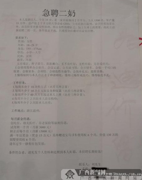 記者在網(wǎng)上找到了這張啟事的圖片,上面介紹說(shuō),招聘二奶的主角是浙江溫州一家服裝公司的CEO,姓劉,招聘的目的是為了滿足“工作出差、生活上的需要!