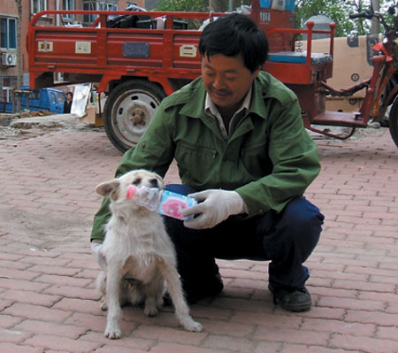 這只流浪的小狗叫小丑兒,原來(lái)的主人住在星海街,因?yàn)榘峒叶鴮⑺z棄了。今年4月大,連降了一場(chǎng)很大的雨雪,因天氣的原因,收廢品的王先生沒(méi)有出門,在家中把幾天收的廢品整理一下。在搬廢品的時(shí)候,王先生突然聽到類似呻吟的聲音,于是就順著聲音找去,看到了一只白色的小狗蜷縮在廢品邊上,瑟瑟發(fā)抖,無(wú)精打采的,眼睛里流露出求助的神情。王先生把它抱進(jìn)屋,并給它吃的喝的。當(dāng)天氣暖和時(shí),王先生便把小狗送到了門外,準(zhǔn)備放走,可這只小狗怎么也不肯離開王先生。從此,王先生出去收廢品的時(shí)候,走到哪里,小丑兒便跟到哪里,還把街上被人遺棄的瓶子,撿到王先生的跟前。后來(lái),王先生從鄰居們那得知小丑兒的經(jīng)歷,便把它留在了自己身邊。