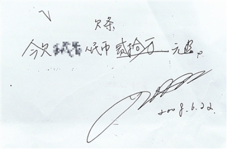 拿到錢(qián)后,雅暉寫(xiě)了張欠條:“今欠老婆人民幣二十萬(wàn)!背_(kāi)始沒(méi)有細(xì)看,隔了兩天,又覺(jué)得不妥,找了個(gè)合適的機(jī)會(huì)提醒了雅暉一下,“他把老婆改成了我的名字,但是簽名是用的藝術(shù)簽名,一共有8條弧線(xiàn),我實(shí)在沒(méi)認(rèn)出來(lái),不過(guò)我想以后都快是夫妻了,還計(jì)較這些干什么呢?”