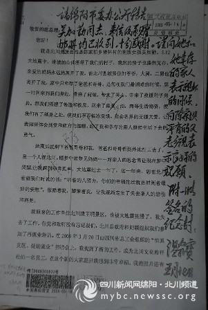 “請綿陽市委辦公廳轉(zhuǎn)告吳加勤同志,來信及承贈郵冊均已收到,十分感謝。謹(jǐn)向她和她幸存的家人表示親切的問候,向陳家壩所有的父老鄉(xiāng)親表示良好的祝愿。附一簽名的紀(jì)念封。溫家寶 五月十七日”。(楊亦萱)