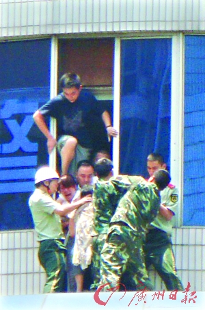 中午12時(shí)左右,4名消防官兵突然從另外一邊的窗口出現(xiàn)在平臺(tái)上,由于平臺(tái)是繞著醫(yī)院的柱形墻體修建的,挾持人質(zhì)的女子并沒(méi)有發(fā)現(xiàn)救援的官兵。趁著談判人員吸引該女子注意力的時(shí)候,四名消防官兵慢慢向女子所站的地方接近。