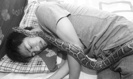 年輕人飼養(yǎng)另類動(dòng)物已不足為怪,但住在武昌梨園附近26歲的趙晶養(yǎng)了緬甸蟒、平原巨蜥、蝎子等多種動(dòng)物,他工資的大部分都用來(lái)飼養(yǎng)動(dòng)物了。更讓人驚訝的是,他常年與蟒蛇同床共眠。
