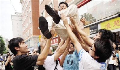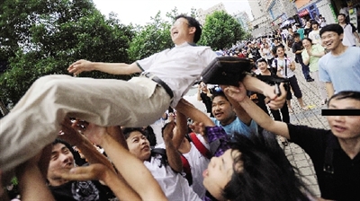 高考最后一門英語(yǔ)結(jié)束了,對(duì)緊繃的高三學(xué)生來說,這是一個(gè)歡樂的時(shí)刻,輕松的時(shí)刻。周南中學(xué)十幾名高三學(xué)生,剛走出長(zhǎng)沙一中考點(diǎn),便將班主任吳老師舉起拋向了空中。