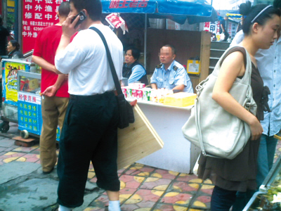 6月13日,網(wǎng)友“透明”在大渝網(wǎng)發(fā)帖稱,當日他前往楊家坪辦事,看到一個光頭城管正在幫一個小販看攤,詫異之余用手機拍下了這一幕。記者從照片中看到,在人行道上,一個由一把太陽傘和一個玻璃柜臺組成的雜貨攤后面,該城管正悠閑地坐著,似乎很享受守攤的感覺。