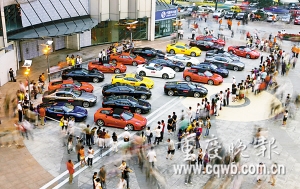 “我長這么大,還從來沒有一次看到這么多名貴的豪車!弊蛳挛,市民許小姐逛街經(jīng)過江北觀音橋步行街遠(yuǎn)東百貨,門前廣場的一幕讓她差點(diǎn)合不攏嘴:23臺總價接近億元的法拉利、瑪莎拉蒂豪華跑車發(fā)動機(jī)低鳴,然后依次停放在她的面前。