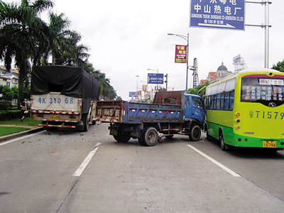 本月3日上午10時,一男子駕駛粵T/H45×9大貨車在南三公路三角路段由超車道變主車道過程中,被后面同在超車道行駛的粵K310×8大貨車撞上了左后角,之后,粵T/H45×9大貨車失控沖過主車道又與在慢車道行駛的粵T157×4購物免費(fèi)接送車發(fā)生碰撞,事故造成購物免費(fèi)接送車上的一名乘客骨折受傷,三車受損。