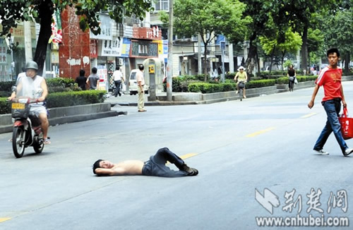 事發(fā)昨日正午,記者在漢陽郭茨口看到,一名男子上身裸露,手提一袋醫(yī)院的病歷資料,情緒激動(dòng)地躺在馬路中央,脊背被路面燙得通紅。此時(shí)路面車流不息,該男子處境十分危險(xiǎn)!翱彀阉貋恚 睅酌啡艘姞詈,靠近該男子,欲將其拉到路邊,但該男子并不領(lǐng)情,堅(jiān)決不起身。幾分鐘后,二橋派出所的民警趕來,要求該男子去派出所再說,該男子置之不理。民警表示,早8時(shí)許和10時(shí)許,該男子曾在附近路面躺過兩次,都被他們帶回了派出所,他們這已是第三次為該男子出警!坝惺裁次驼f出來,那樣心里痛快點(diǎn)!币娒窬譄o策,熱心路人們開始輪番上前勸解。眾路人汗流浹背,頂著烈日站在馬路中央,對(duì)該男子動(dòng)之以情、曉之以理。半小時(shí)后,該男子陸續(xù)說出了心中的不快。又經(jīng)勸解,該男子終于答應(yīng)跟民警回派出所,將事情說清楚。