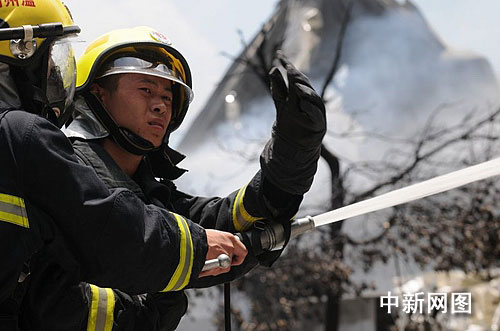在整個(gè)火災(zāi)現(xiàn)場,消防戰(zhàn)士手中的水槍有遠(yuǎn)攻,也有近距離疾射。大致目測一下,最近的消防戰(zhàn)士距離火源不到兩米遠(yuǎn)。熊熊燃燒的烈火輻射出的溫度可達(dá)七八十度,在高溫的熏烤下,參加滅火的消防官兵面孔紅通通,汗水匯成了一道道水線,不斷的往下流。