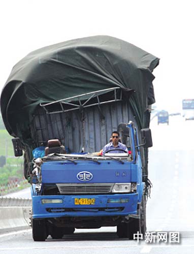 中新網(wǎng)杭州7月27日電(記者 龔讀法 通訊員周銘)在7月25日下午,記者在浙江省杭州市采訪途中發(fā)現(xiàn)非常雷人的一幕:104國道瓶窯段,一輛閩C牌照的大貨車,滿載貨物急速行駛著,但是仔細(xì)一看,這輛貨車的駕駛室卻是“敞篷”的。這樣的景象嘆為觀止。