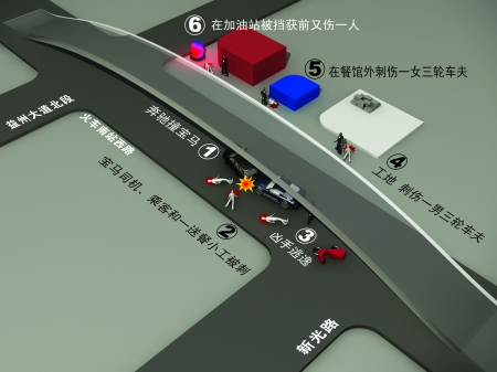 昨日中午12時許,一輛奔馳車和一輛寶馬車在(成都市)火車南站西路追尾。車禍發(fā)生后,奔馳車司機用兇器刺傷寶馬車上兩名女子和一名送餐小工。據(jù)知情人士稱,寶馬車上一名女傷者是市內(nèi)某大型家具城老板的妻子。隨后,奔馳車司機往火車南站方向跑去,一路上,先后刺傷了兩名火三輪司機,最后跑進距現(xiàn)場100多米的加油站,在刺傷一人后,被眾人合力捉住。
