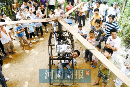 大家爭相目睹的是一個由三角鐵、鋼管、摩托車發(fā)動機(jī)及榆木板做成的“直升機(jī)”。