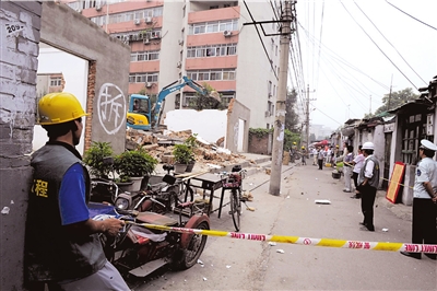 這處違法出租大院位于東木樨園11號樓和13號樓中間。昨天上午9點(diǎn)多,隨著豐臺區(qū)城管人員一聲令下,一輛小型挖掘機(jī)將吊臂揮向一堵墻面,墻面應(yīng)聲轟塌!澳憧矗u墻里都沒有水泥,只有沙土!必S臺區(qū)東鐵匠營街道辦事處一名工作人員邊說邊指給記者看,“這樣的房子出租,安全隱患太大了!辈鸪ぷ饕齺頂(shù)十名居民觀看。聽說以后這塊地要建成健身場所,居民們都特別高興。一位大媽說,小區(qū)周圍沒有綠地,也沒有健身地方,居民們鍛煉一直特不方便。