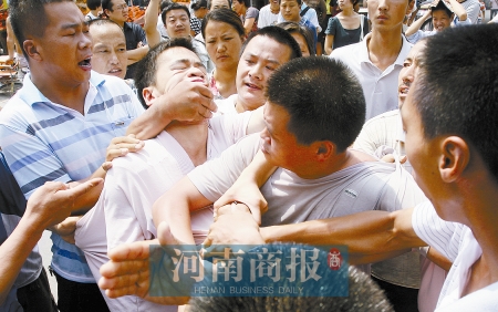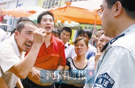這時(shí)又沖來一中年男子,與執(zhí)法隊(duì)員撕扯起來,場(chǎng)面一片混亂。一攤販告訴記者,這人是朱林的丈夫,姓許,信陽(yáng)固始人,兄妹八人都在附近做生意。這一帶賣水果的都是信陽(yáng)老鄉(xiāng),來鄭做生意已有十多年。