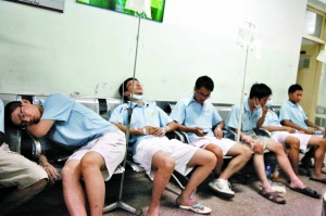 昨日凌晨,北醫(yī)三院急診大廳內(nèi)擠滿了身穿“北京郵電大學”服裝的輸液學生。