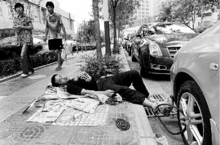 洪作剛說(shuō),他擔(dān)心即使通過(guò)法律途徑對(duì)方也不肯還錢(qián)。于是,8月13日下午,他買(mǎi)來(lái)一把U型大鎖,白天就將車(chē)鎖在下水道鐵柵欄上,連著3天晚上,怕自己睡著、老板將車(chē)開(kāi)走,他就將鎖子的另一頭鎖在自己的腳踝上。晚上,他就睡在馬路邊的報(bào)紙上,路邊蚊子多,他就在周?chē)c(diǎn)上四盤(pán)蚊香。