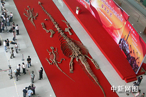 中新網(wǎng)北京8月18日電 (記者 孫自法)三具侏羅紀(jì)時(shí)期的恐龍化石,十八日下午在它們的“新家”——中國科學(xué)技術(shù)館新館揭開“紅蓋頭”,正式由云南省楚雄彝族自治州“嫁”入北京落戶中國科技館新館,并將于下月中旬新館開放后進(jìn)行永久性展出。
