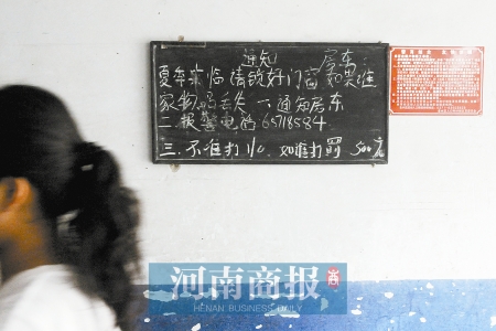 李先生是這棟樓的房東,身后墻壁掛的黑板上,寫著一則通知:“夏季來臨請鎖好門窗,如果誰家物品丟失:一、通知房東;二、報警電話65718584;三、不準(zhǔn)打110,如誰打罰500元!