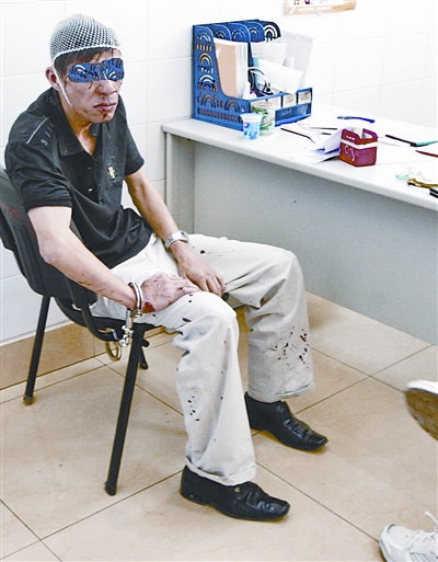 昨日(26日),一血流滿面的中年男人戴著手銬,被警察帶進(武漢)市六醫(yī)院急診室,該男子是因偷車而被市民打成這樣的。
