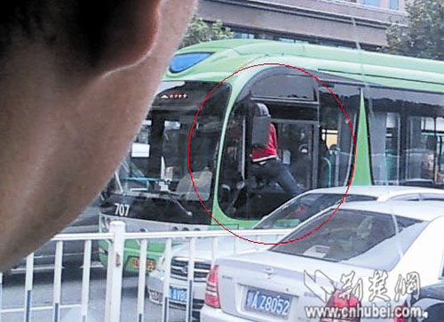 一名網(wǎng)友拍到了整個過程,并發(fā)到了網(wǎng)上,圖片顯示:一名穿紅色上衣的男子腳踩在一輛銀色轎車上,上半身鉆進公汽的駕駛室里,毆打公汽司機。該網(wǎng)友稱,被打的是707路公汽司機,公汽司機一直沒還手。