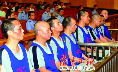 昨日,涉案15名被告人和1家被告單位在東莞中級(jí)人民法院過堂受審(如圖,蘇仕日攝)。公訴機(jī)關(guān)認(rèn)為應(yīng)以銷售偽劣產(chǎn)品罪追究其刑事責(zé)任。公訴人花了40分鐘才讀完近萬字的起訴狀,狀中列舉了26宗假煙販賣指控。
