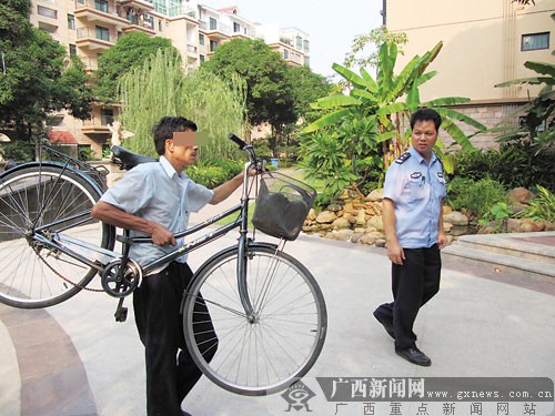 9月26日下午,一名小偷在(廣西)南寧市大學(xué)路嘉慧馨源小區(qū)偷得一輛自行車,準(zhǔn)備推車離開時,卻遇到了車主——該小區(qū)的一名保安。車主抓住小偷后,讓其扛車在小區(qū)示眾。