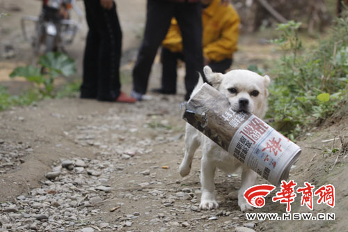 每天上午9時,給李爺爺家送華商報的投遞員張躍進,會準時到達位于西安市南郊的東三爻堡。“報紙來咧!”站在李爺爺家門前一段50多米長的坡路下,張躍進會扯著嗓子吆喝一句。幾秒鐘后,張躍進和周圍的鄰居便會看到,一條黃白相間的小狗,從坡路上飛快地跑來,用嘴叼起張躍進遞來的報紙!翱烊!把報紙給爺爺!甭犃藦堒S進的話,小狗花花扭身徑直跑到李爺爺跟前,把報紙交到老人手中。
