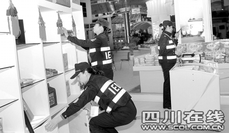 昨晚10點,新會展中心各展館里一片忙碌。在一群正在安檢的帥氣黑衣特警中間,3個扎著發(fā)髻的女特警格外引人注目。除負責(zé)現(xiàn)場指揮的教導(dǎo)員吳虹外,28歲的羅蕾正用伸縮臂鏡檢測著一食品展臺頭頂?shù)闹,而今年剛(cè)刖闹苋兀瑒t彎腰在一排展柜前仔細檢查著。和男特警一樣,她們都穿著帥氣的黑色警服,戴著警帽,不施粉黛,右胸前印有“成都特警”4個大字的閃光背心,將她們襯得格外颯爽。