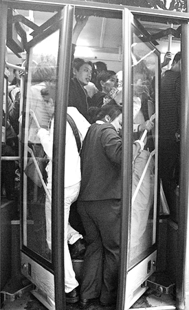 剛上車的一名女乘客手里拿著一盒牛奶,由于前面的一中年男子被擠得重心不穩(wěn),突然往后猛退,女乘客手里的牛奶被擠爆。鵝公巖南橋頭有人下車,站在門邊的記者只能下車讓路。哪知十余人越過記者一擁而上往車上擠。直到車門關(guān)閉,記者也沒能再次擠上車。