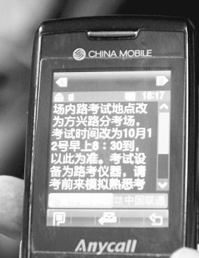 “場地考試點(diǎn)改為方興路分考場,請于10月1日至8日早上8:30到考場進(jìn)行場內(nèi)路模擬,合格后方可參加考試。”國慶節(jié)前夕,很多參加駕駛證直考的考生收到了這樣一條短信,短信后附有考試地址和聯(lián)系電話。